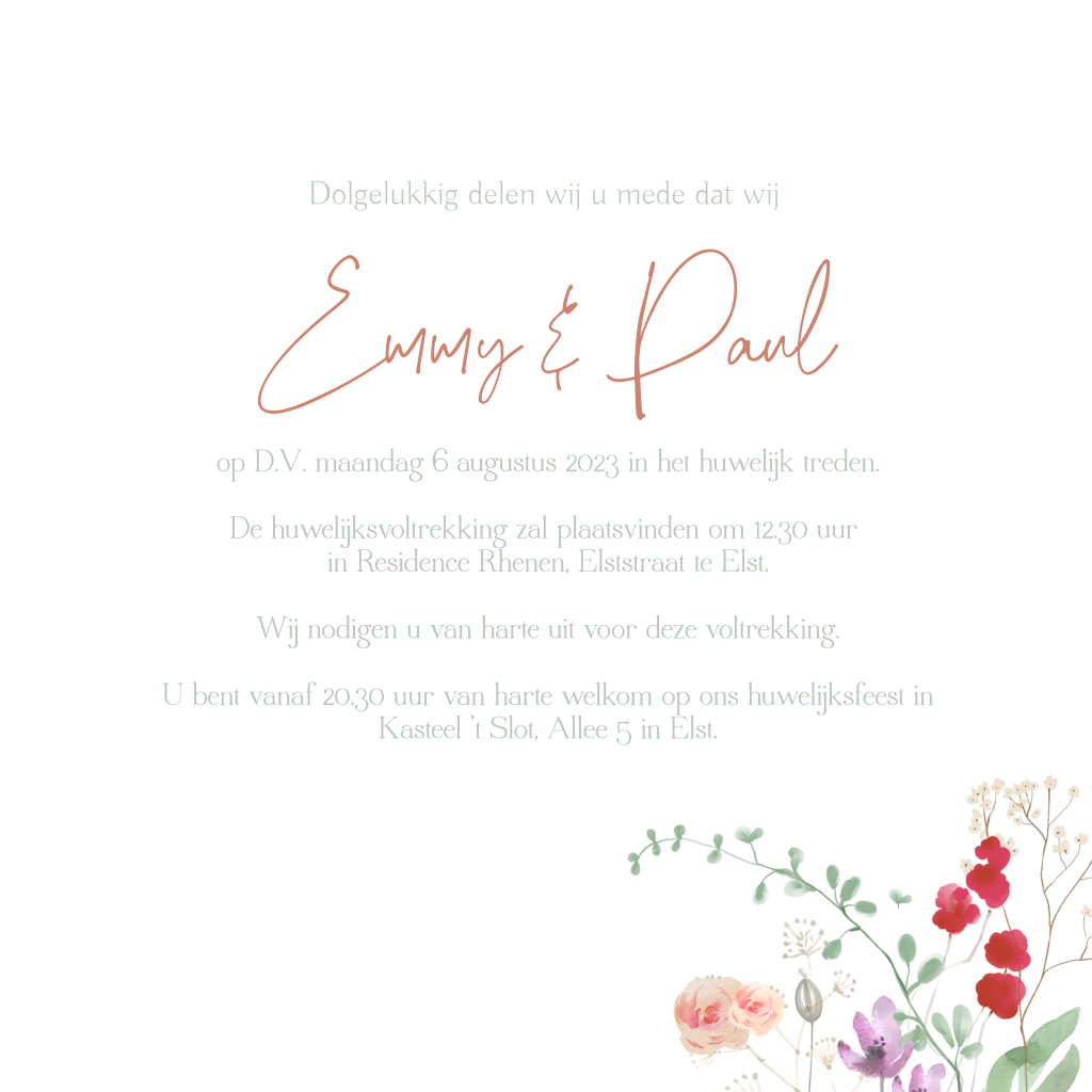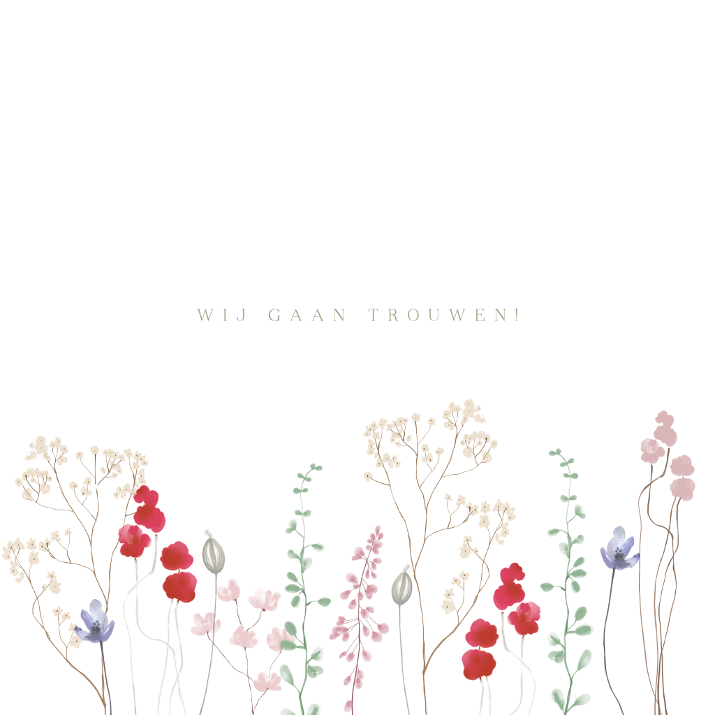 Stijlvolle trouwkaart met getekend veldbloemen in kleuren als rood en roze en takjes folie. (22113)
