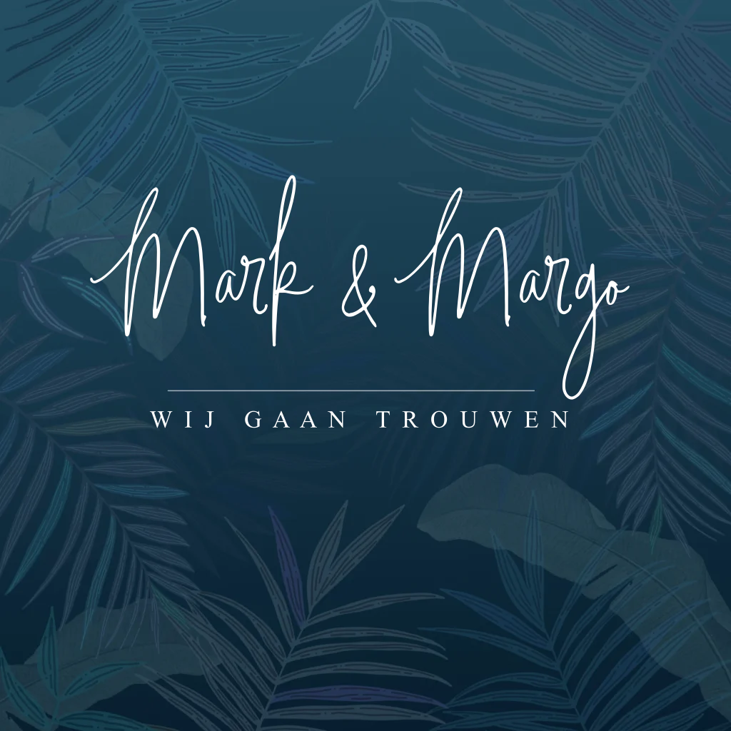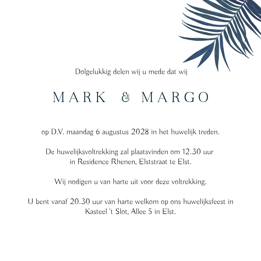Trouwkaart met bladeren botanisch blauw foliedruk