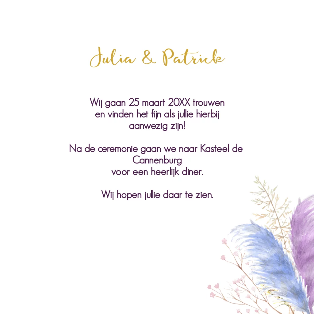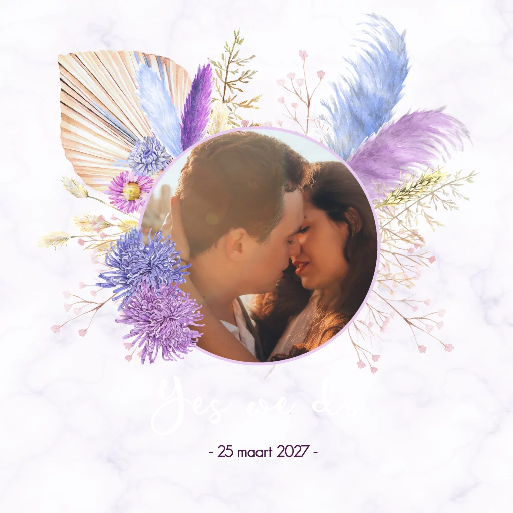 Trouwkaart uitnodiging met hippe droogbloemen in paarse en naturel kleuren. Ruimte voor eigen foto en foliedruk. (22315)