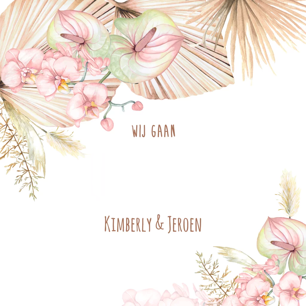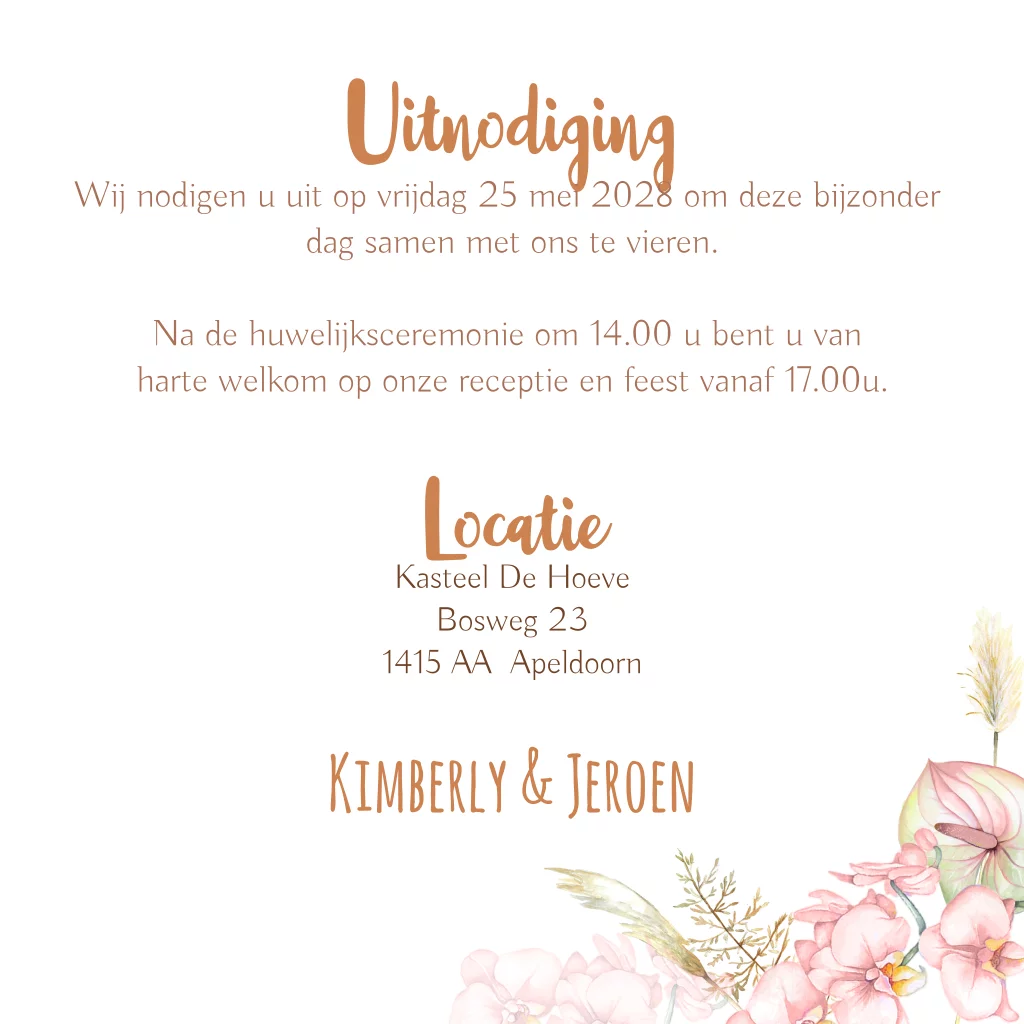 Trouwkaart met hippe gedroogde bladeren en bloemen en orchidee in pasteltint met foliedruk. (20801)