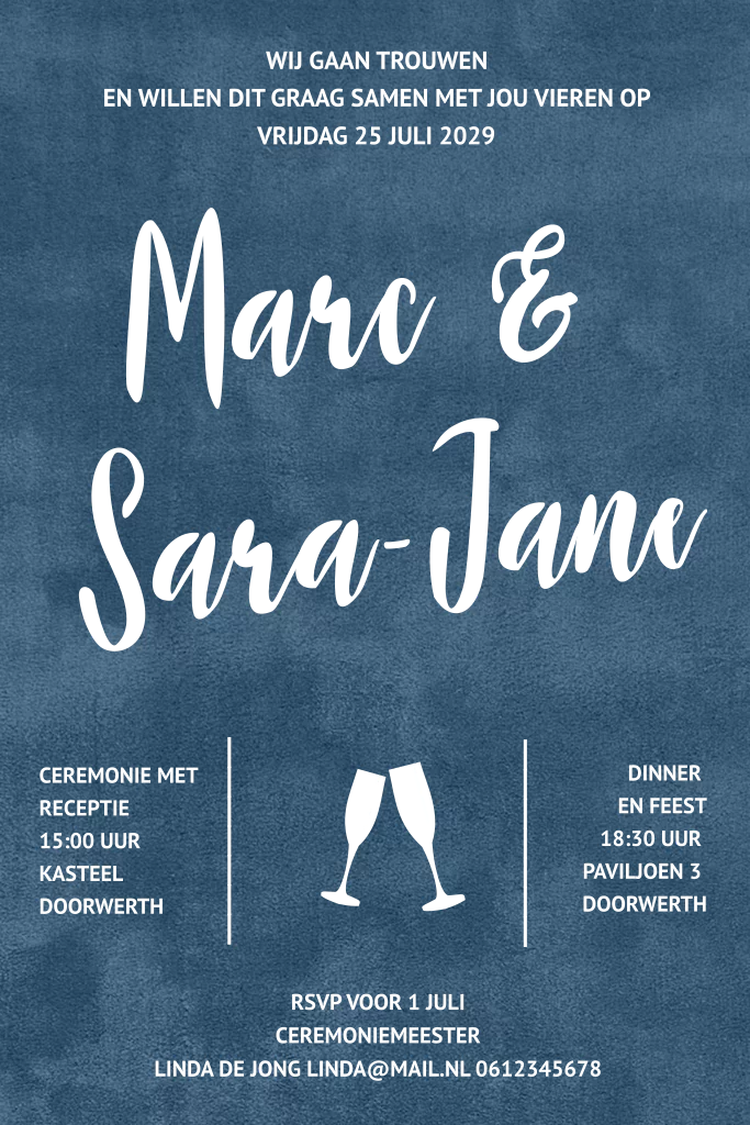 Trouwkaart blauw met rose accenten. De tekst staat in echte foliedruk en de achtergrond heeft een velvet-look. (999999)