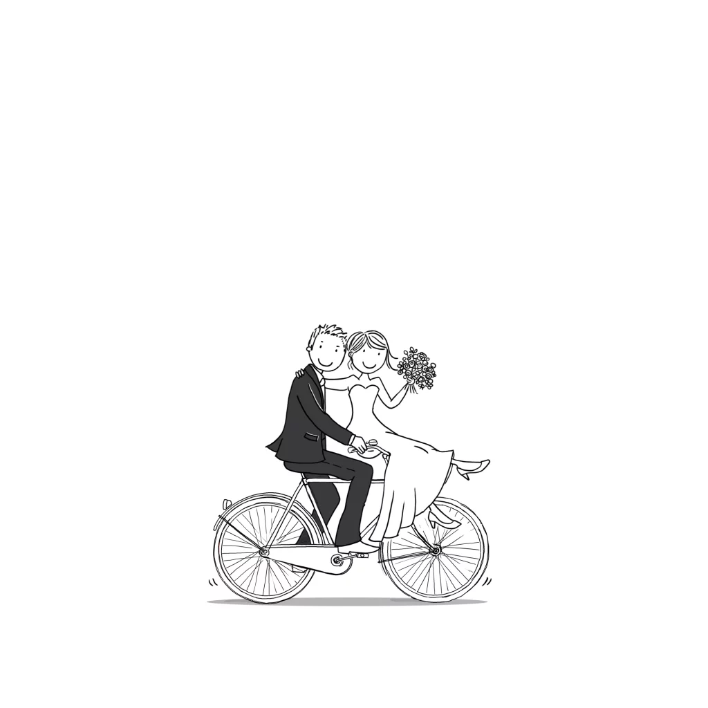 Trouwkaart goudfolie gouden namen op de voorkant met een zwart-wit getekend bruidspaar op de fiets. (20641)