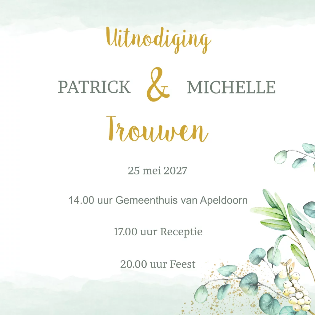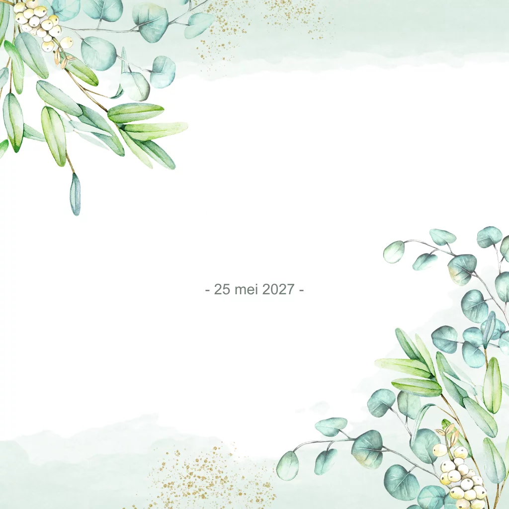 Trouwkaart in botanische stijl met goudfolie met mooi eucalyptus blad in aquarel. (21498)