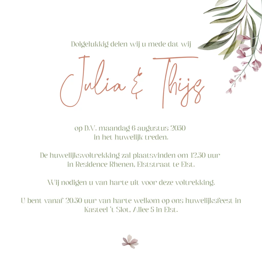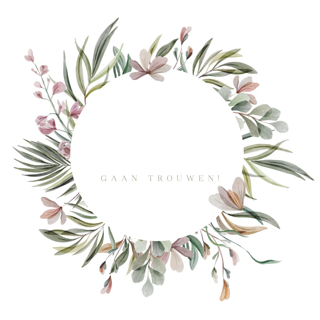 Trouwkaart krans prachtige bloemen en takjes rose foliedruk