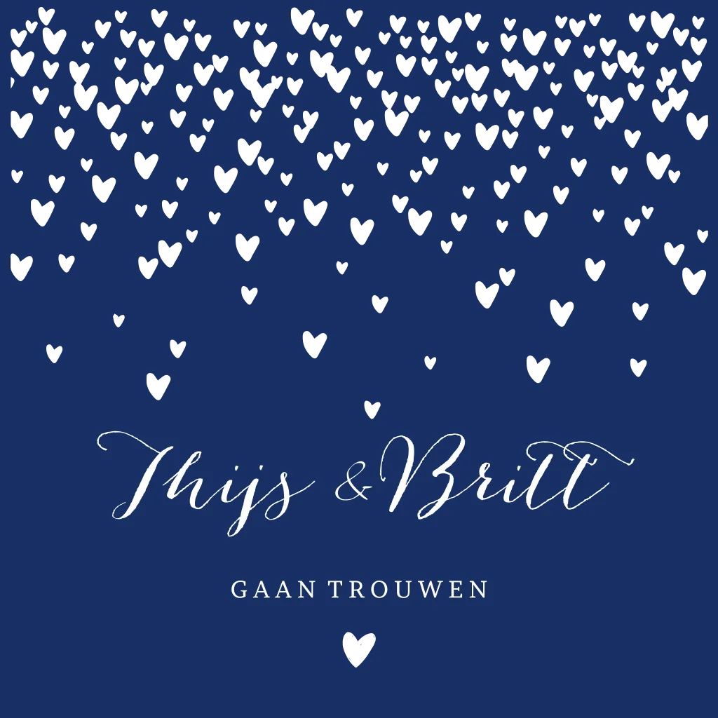 Een stijlvolle trouwkaart in donkerblauw blauw met hartjesregen regen van goudfolie hartjes in goudfolie. Alle kleuren zijn aanpasbaar. Pas ook de teksten aan. (20866)