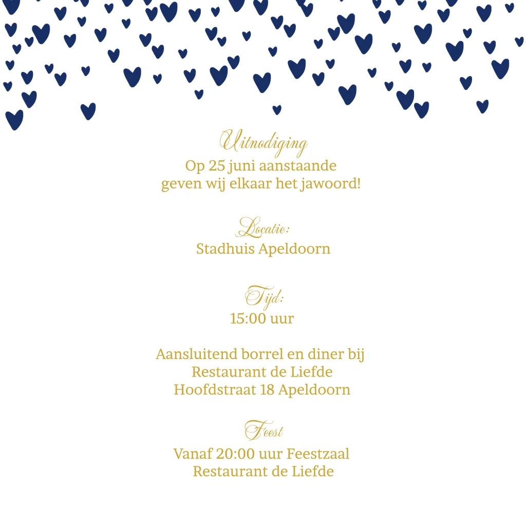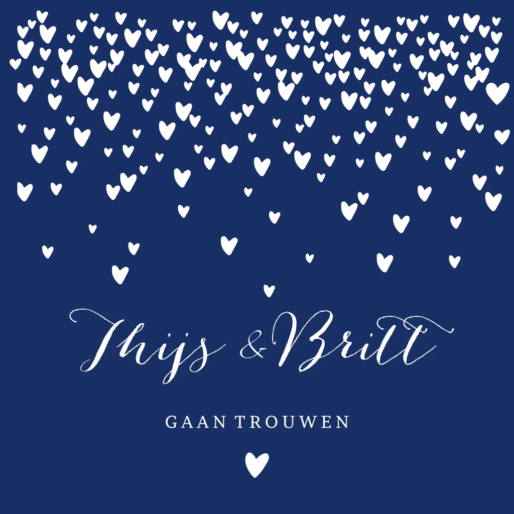 Een stijlvolle trouwkaart in donkerblauw blauw met hartjesregen regen van goudfolie hartjes in goudfolie. Alle kleuren zijn aanpasbaar. (20866) Let op: het kan zijn dat de foliedruk lijntjes aan de buitenkant niet helemaal tot de rand lopen, dit is helaas niet altijd doorlopend te krijgen met foliedruk.