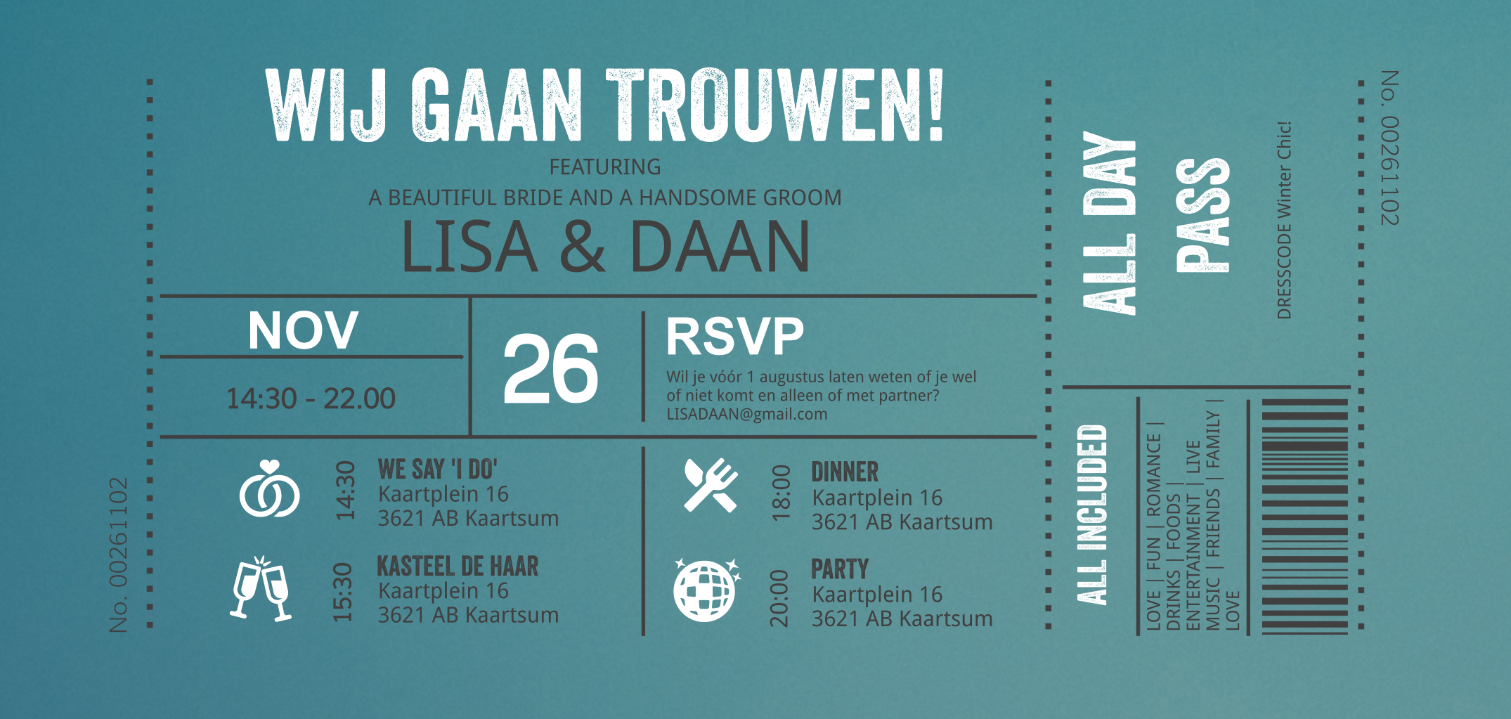 Trouwkaart ticket zilverfolie