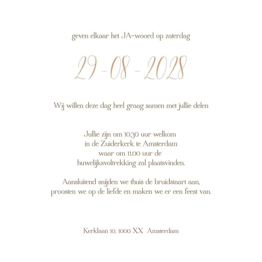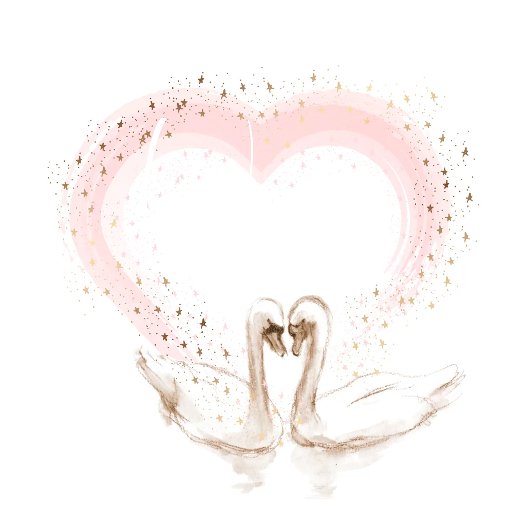 Trouwkaart met twee zwanen handgetekend in sepia pentekening voor een roze hart met sterretjes en stippen en foliedruk. (22382)