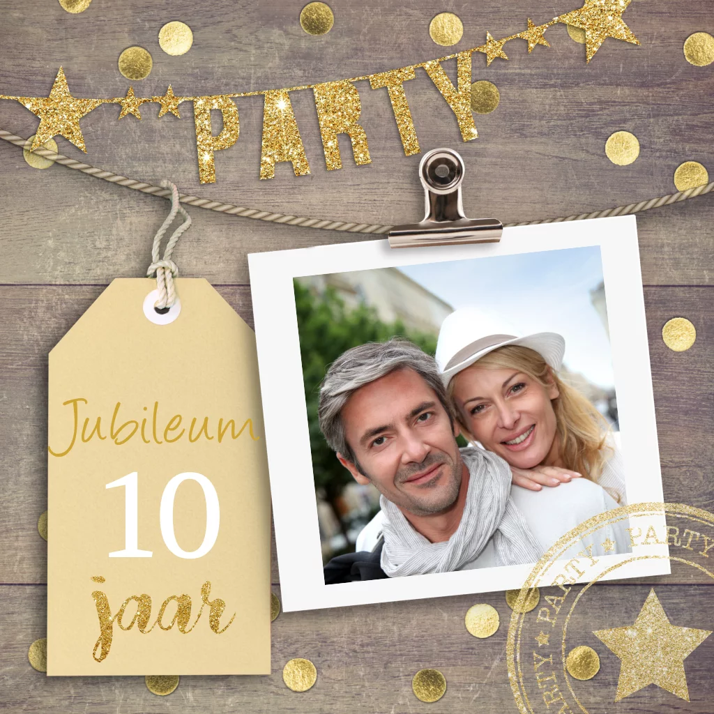 Uitnodiging 10 jarig jubileum met hout en confetti