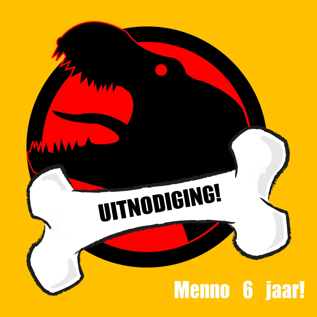 Stoere uitnodiging kinderfeestje geel dinosaurus. Groot wit bot. (544)