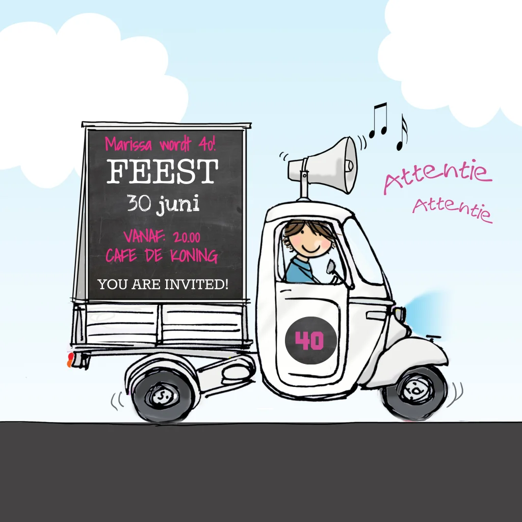 Uitnodiging feest 40 jaar geworden met tekening witte vespa ape. (1545)