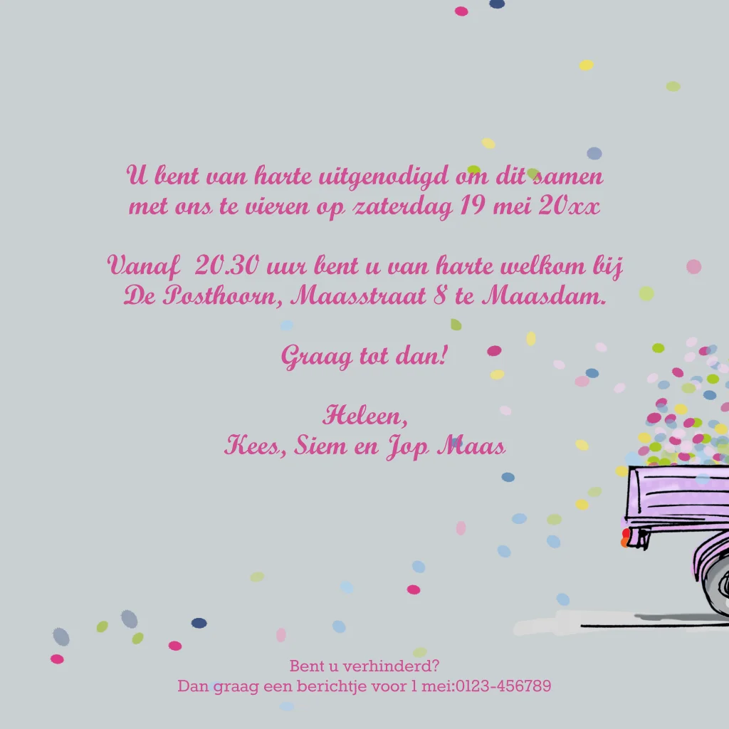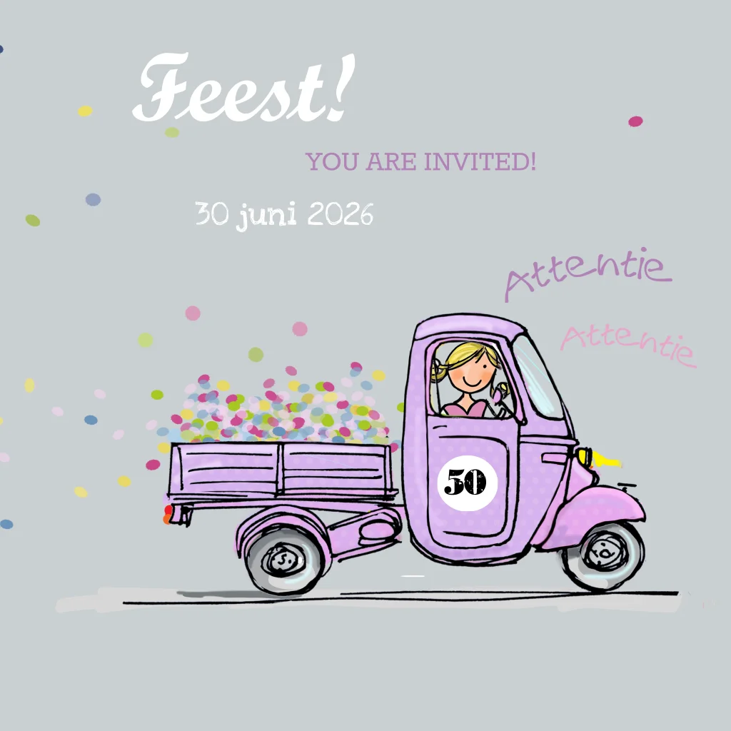 Uitnodiging feestje verjaardag voor een vrouw 50 jaar met paarse vespa ape auto brommer , confetti en bloemen. (1544)
