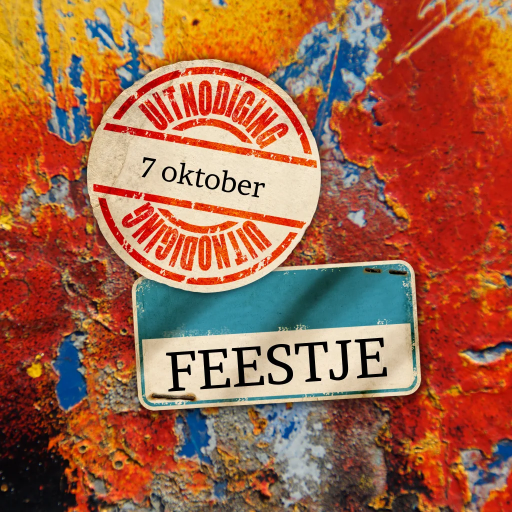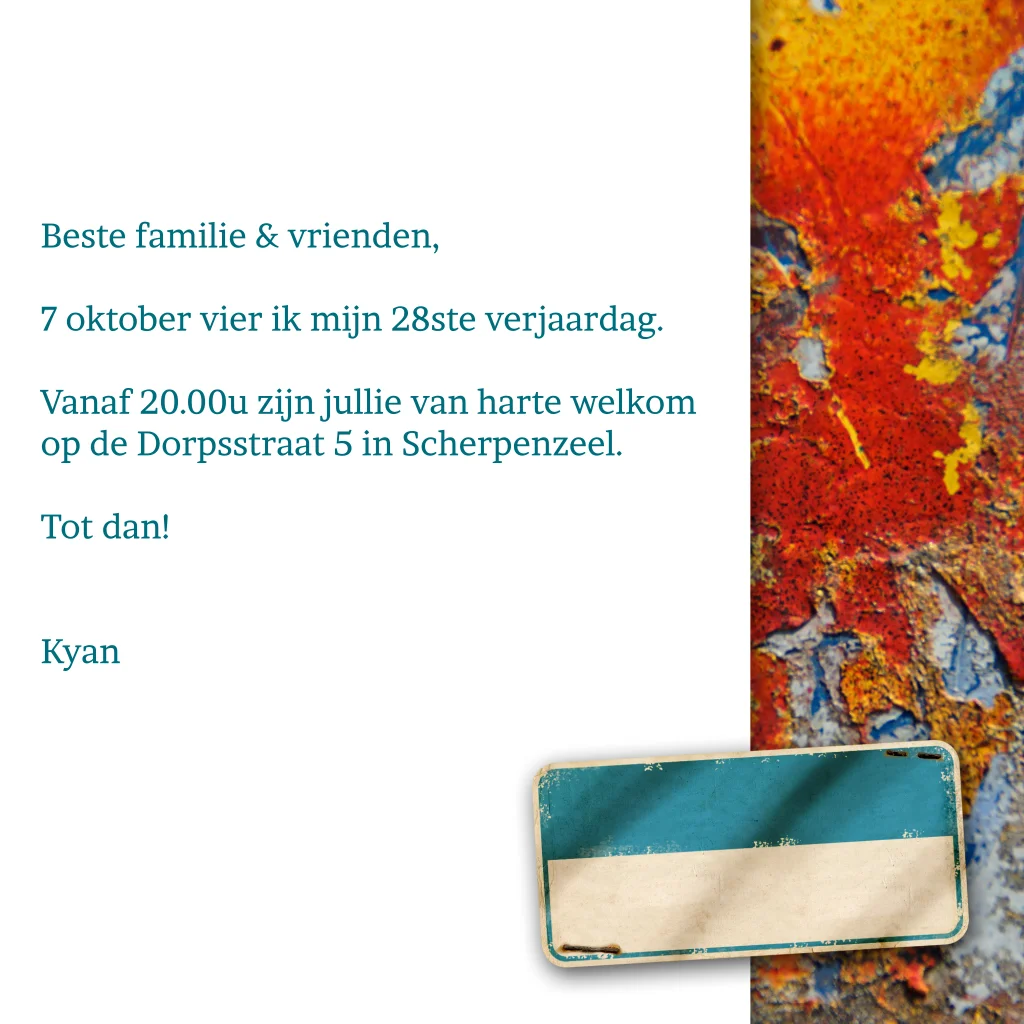 Uitnodigingskaartje voor een feestje met oranje graffiti. Blauw en turquoise op de achtergrond. Stempel met uitnodiging.