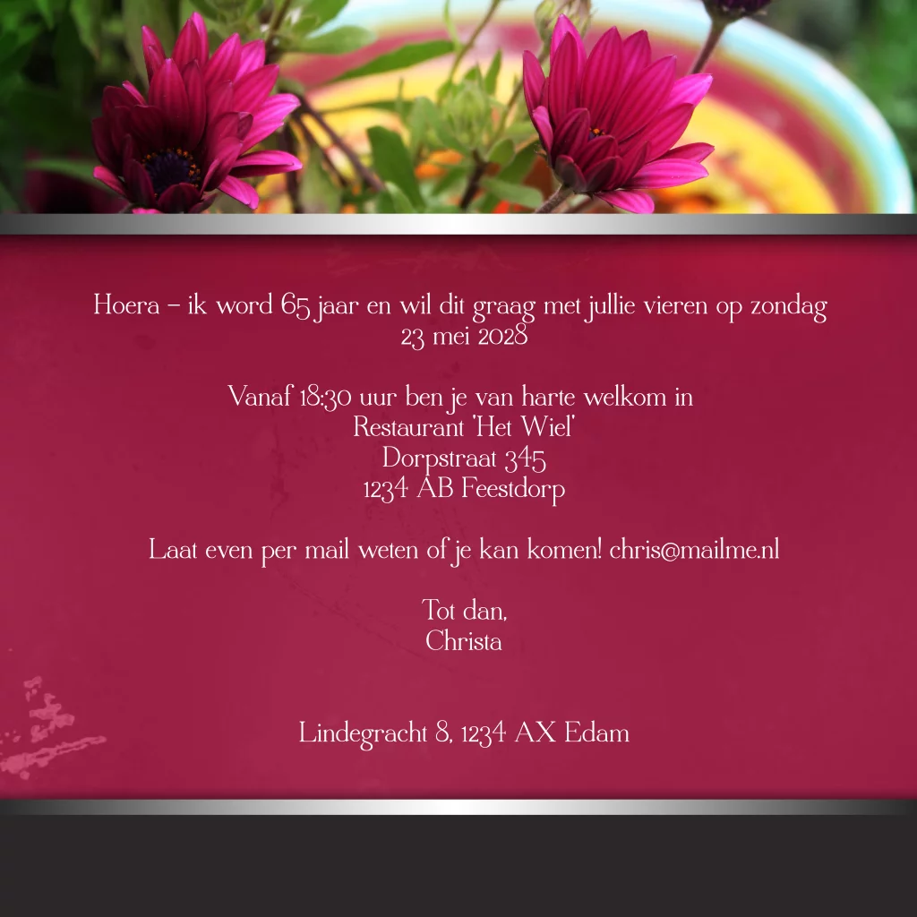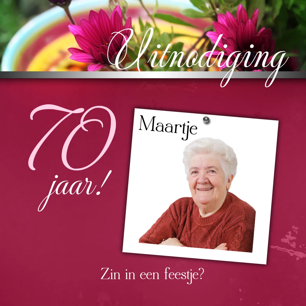 Uitnodigingskaartjes feest 70 jaar met roze bloemen en foto