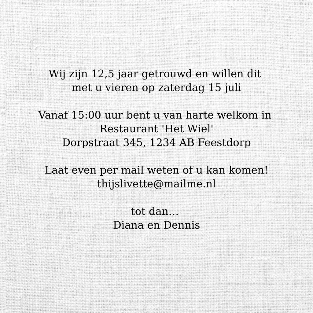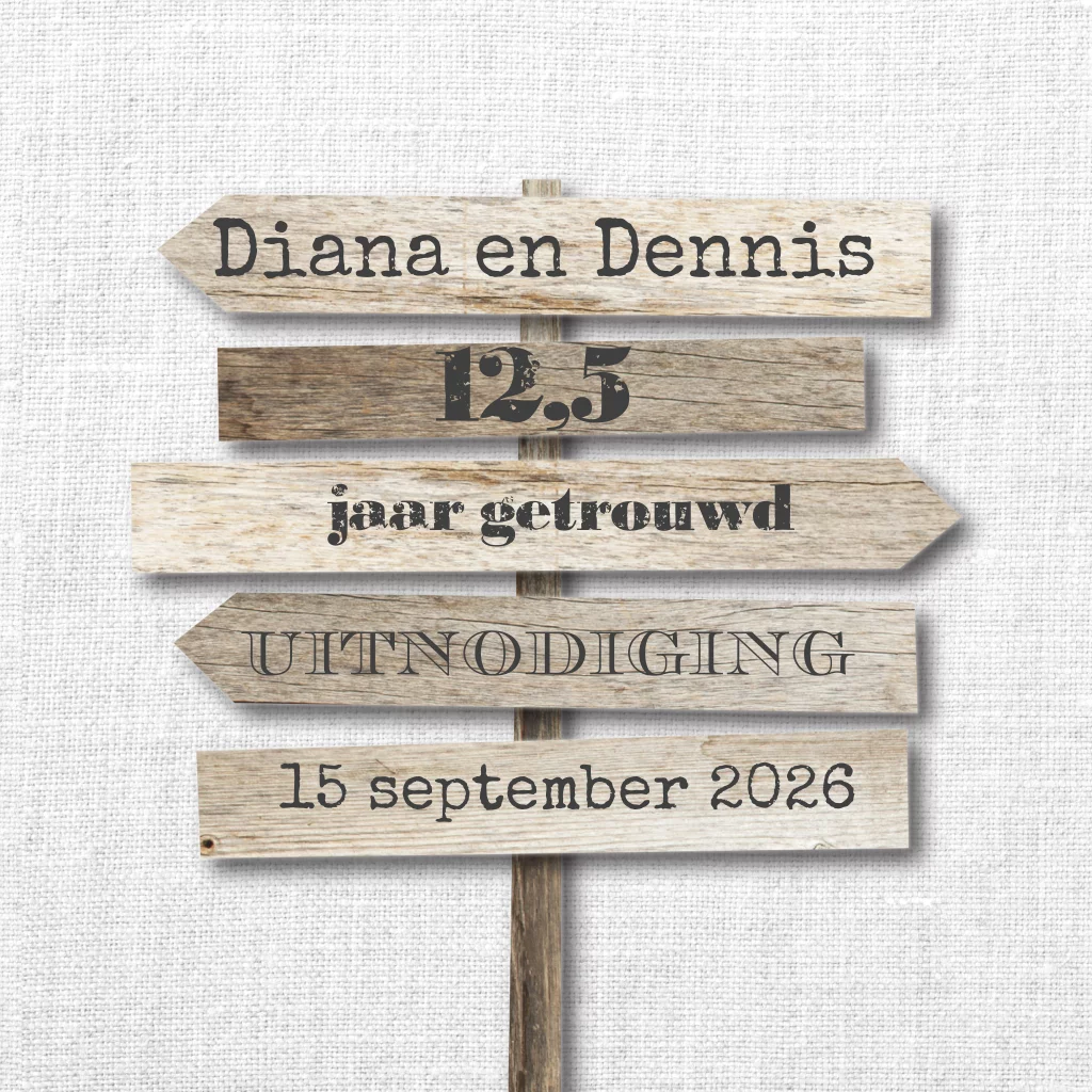 Uitnodiging 12,5 jaar getrouwd op wit linnen met houten wegwijsbord. (2642)