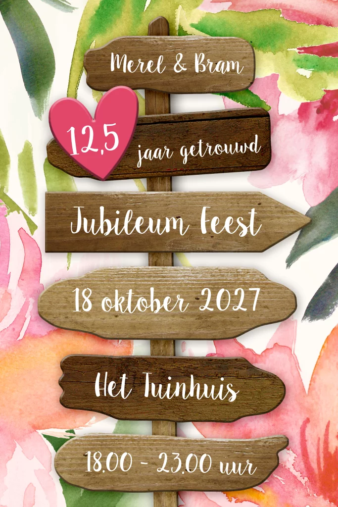 Leuke 12,5 jarig jubileum uitnodiging met houten wegwijzer bordjes, een hart en geschilderde bloemen. Binnen nog passend fotokader voor jullie portret. (21454)