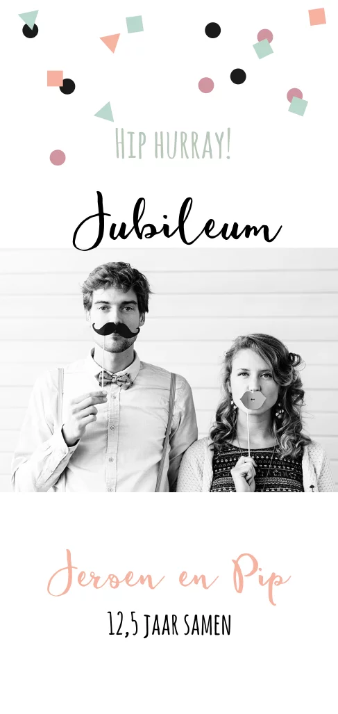 Originele feestelijke uitnodiging voor jullie zoveel jarig jubileum. Super hippe langwerpige kaart met in zwart-wit met pastel confetti. (7250)