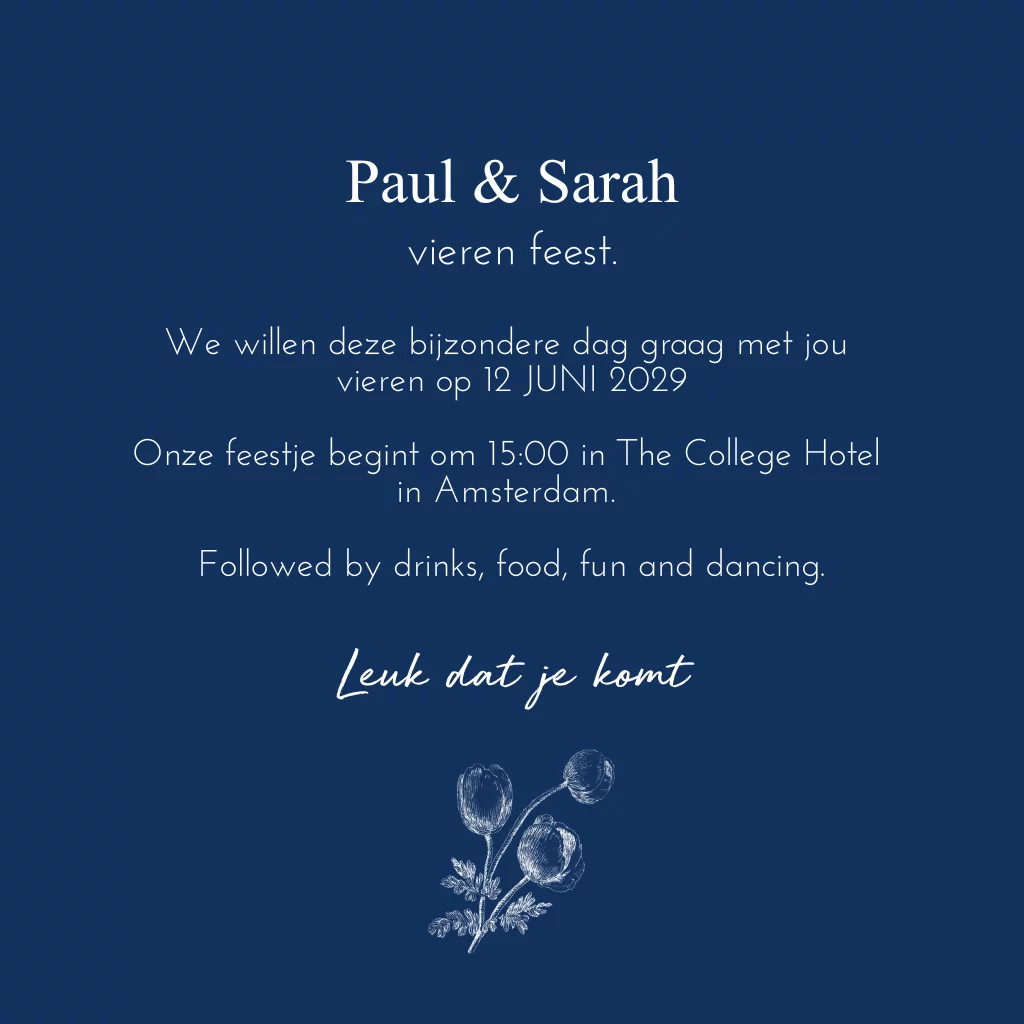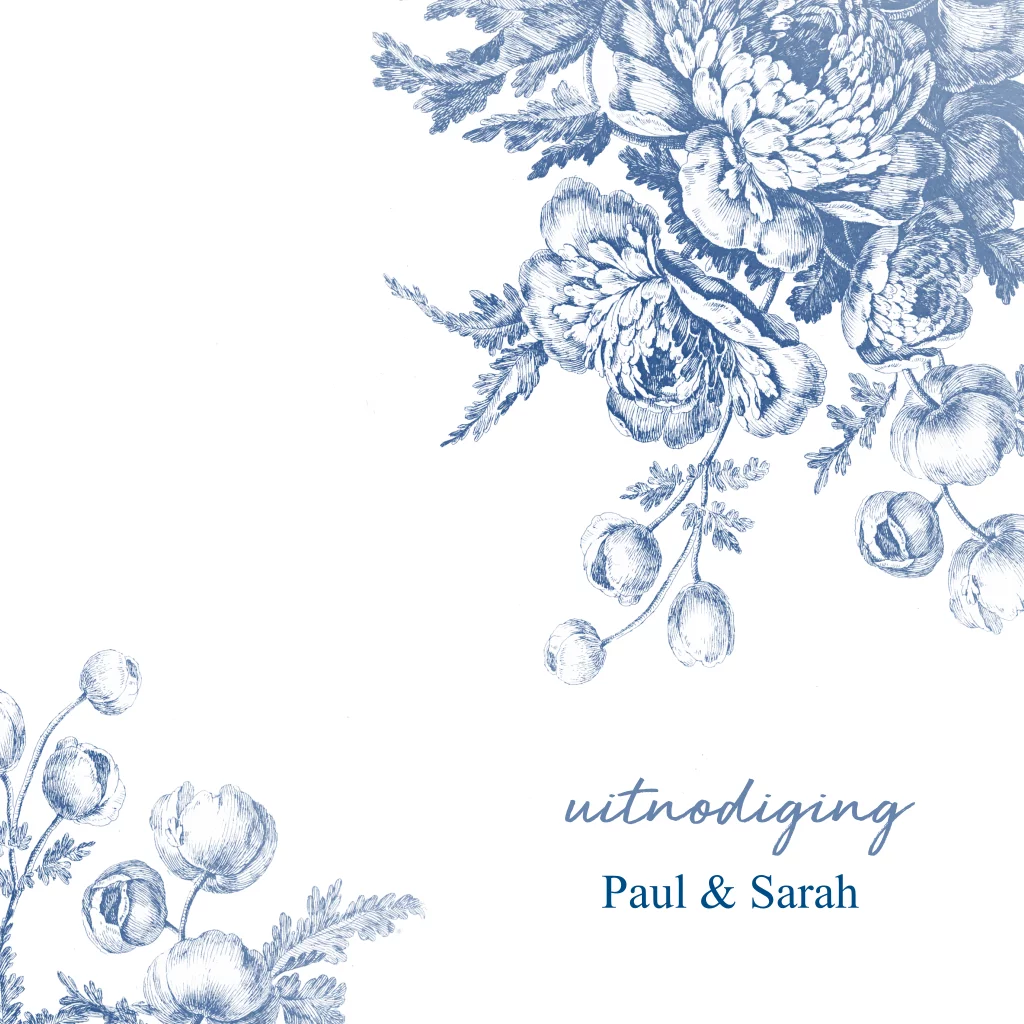 Jubileumkaart uitnodiging met ronde hoeken voor een feestje 12,5 jaar getrouwd bloemen blauw-wit delftsblauw. (21083) (Deze kaart heeft nu ronde hoeken a € 0,30 extra per kaart, in je kunt dit ook met rechte hoeken bestellen)