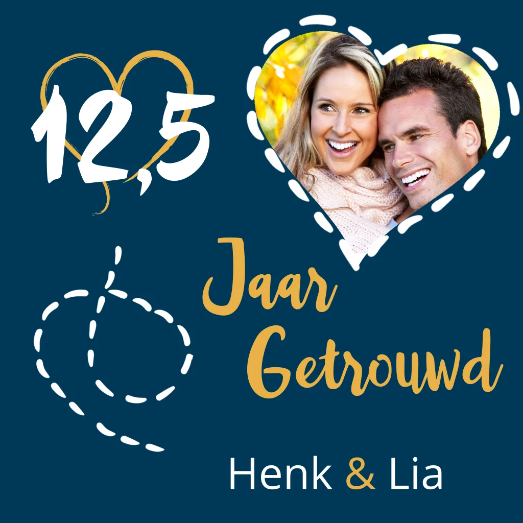 Moderne uitnodiging 12,5 jaar getrouwd feest in een modern blauwe kleur. Trendy design met stippellijntjes en ruimte voor een eigen foto achter een hart. (8634)