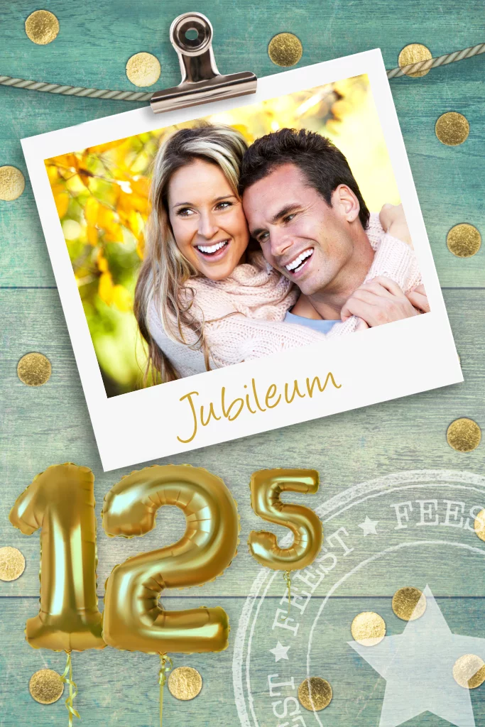 Feestelijke hippe uitnodiging voor een 12,5 jarig jubileum met leuke fotoklem, goud-look ballonnen en stempel. (6191)