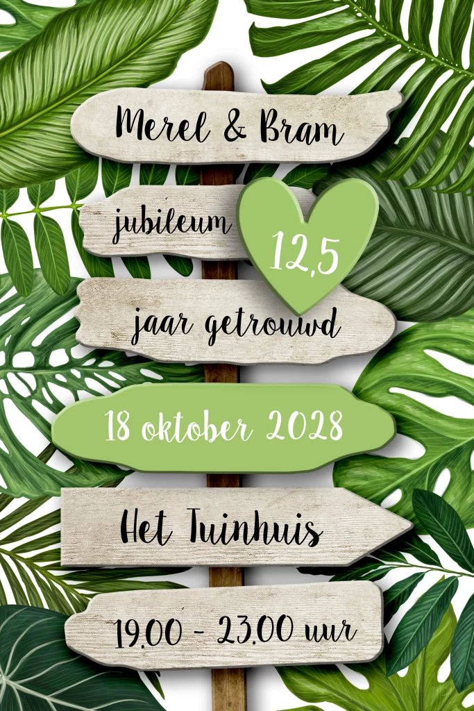 Uitnodiging 12,5 jaar jubileum feest. Een wegwijzer van houten bordjes en veel botanisch blad. Alle teksten zijn aan te passen en binnen is ruimte voor je eigen foto. (21423)