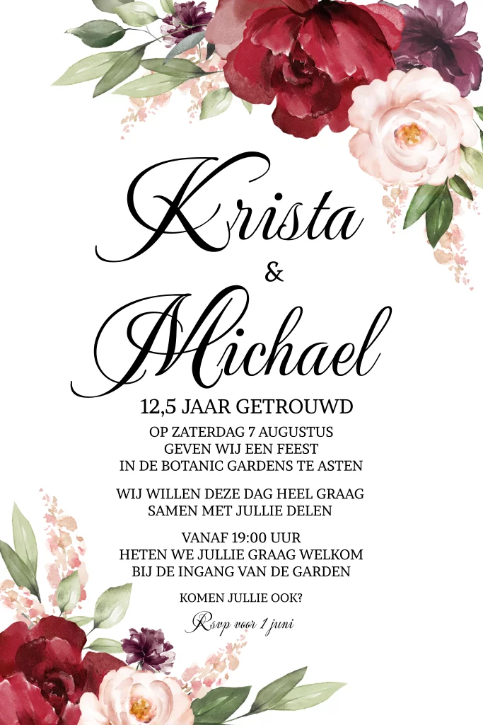Uitnodiging voor 12,5e huwelijksjubileum met rode bloemen