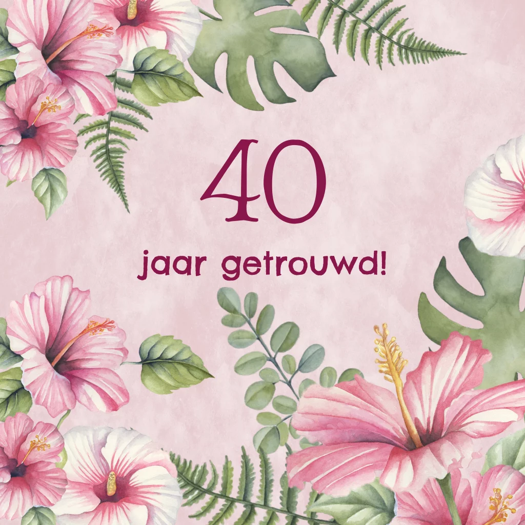 Uitnodiging 40 jaar getrouwd jubileumfeest met mooie tropische bloemen en blad in aquarel op poederroze achtergrond. (4888)