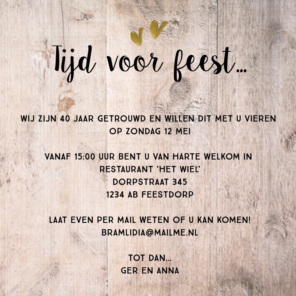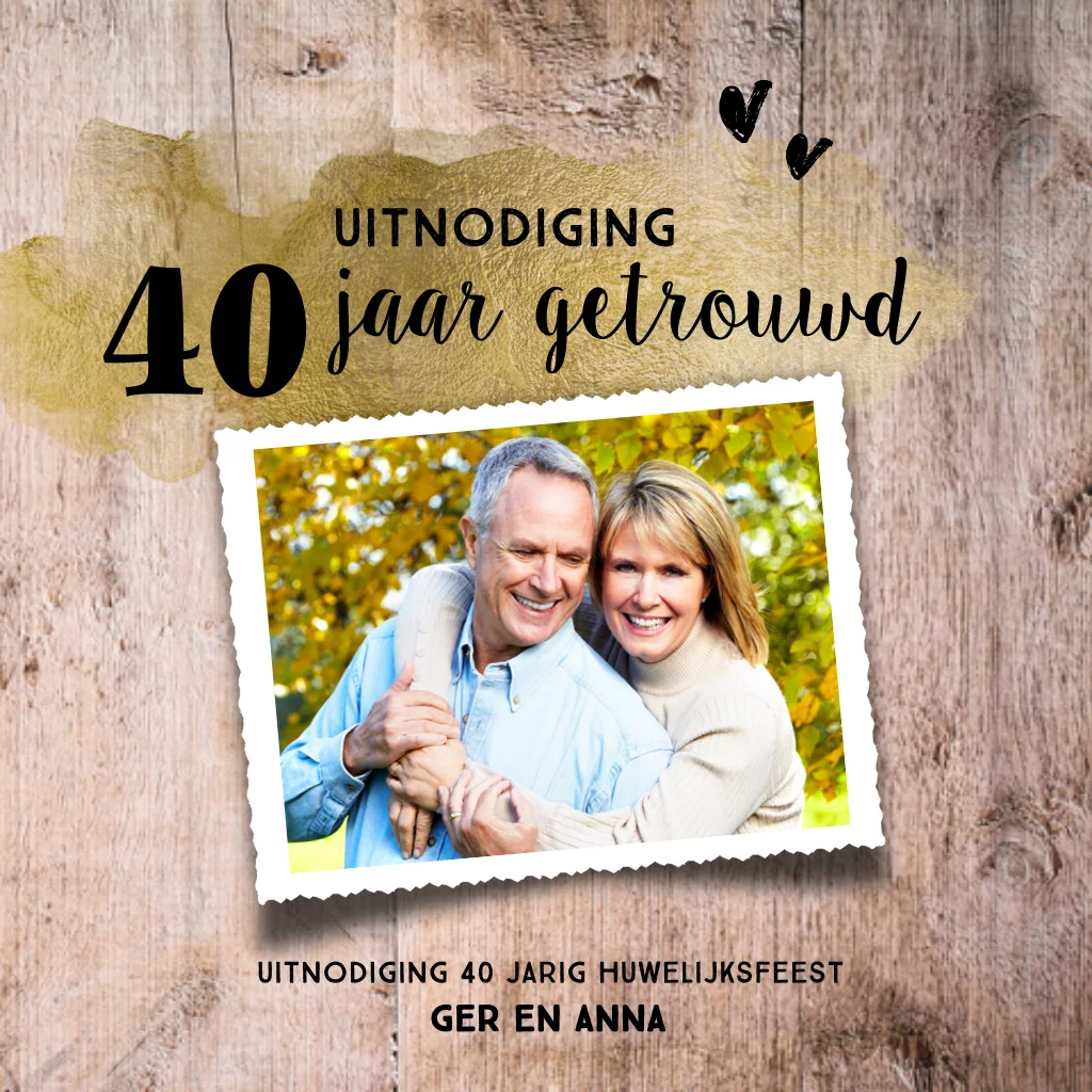 Jubileum uitnodiging 40 jaar getrouwd met goudkleur en donker hout. (6443)