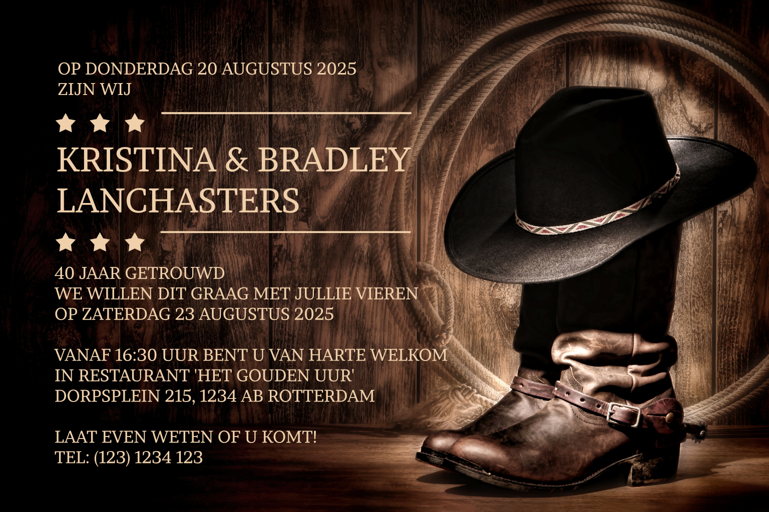 Een 40 jarig jubileum uitnodiging country en western met cowboy laarzen, lasso en hoed. (5497)