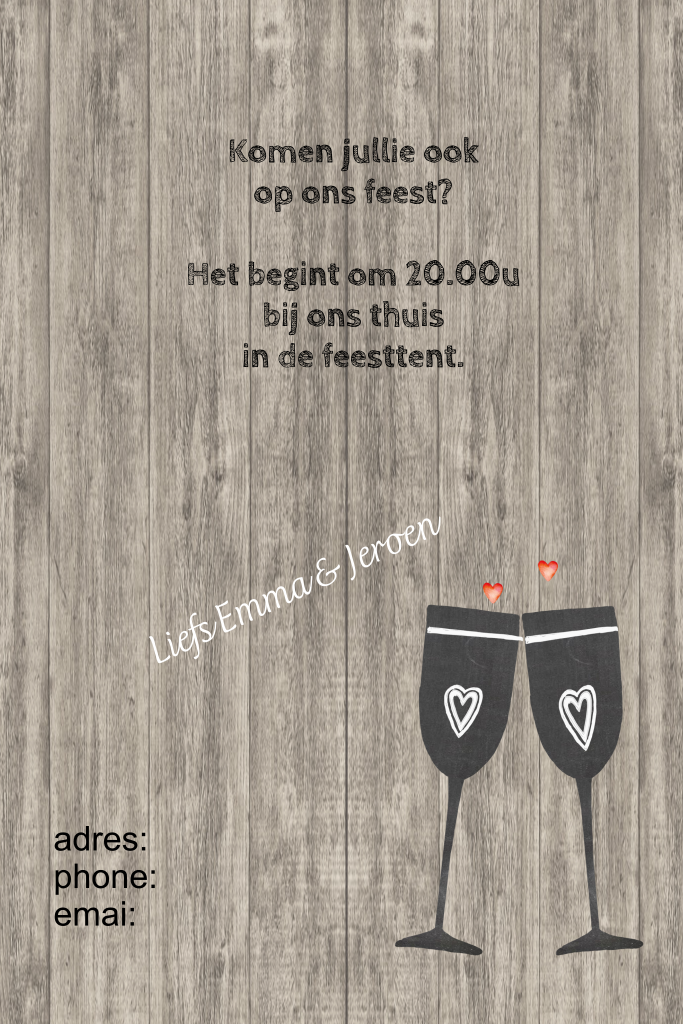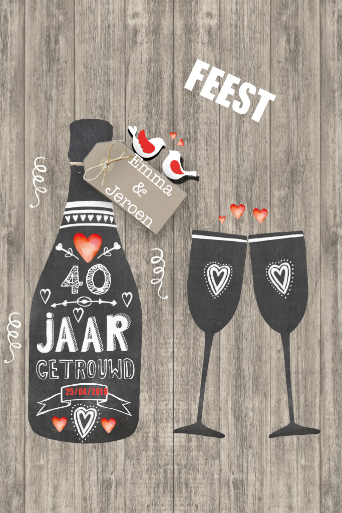 Uitnodiging huwelijksjubileum 40 jaar getrouwd met schoolbord fles en glazen op houtprint met labeltje. (3620)