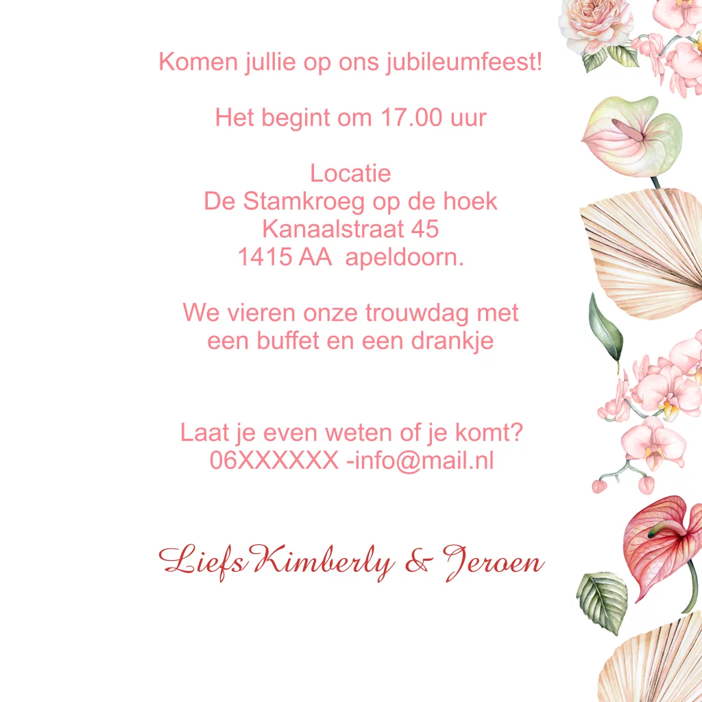 Huwelijksjubileum uitnodiging met mooie romantische bloemen in pasteltint. (20848)
