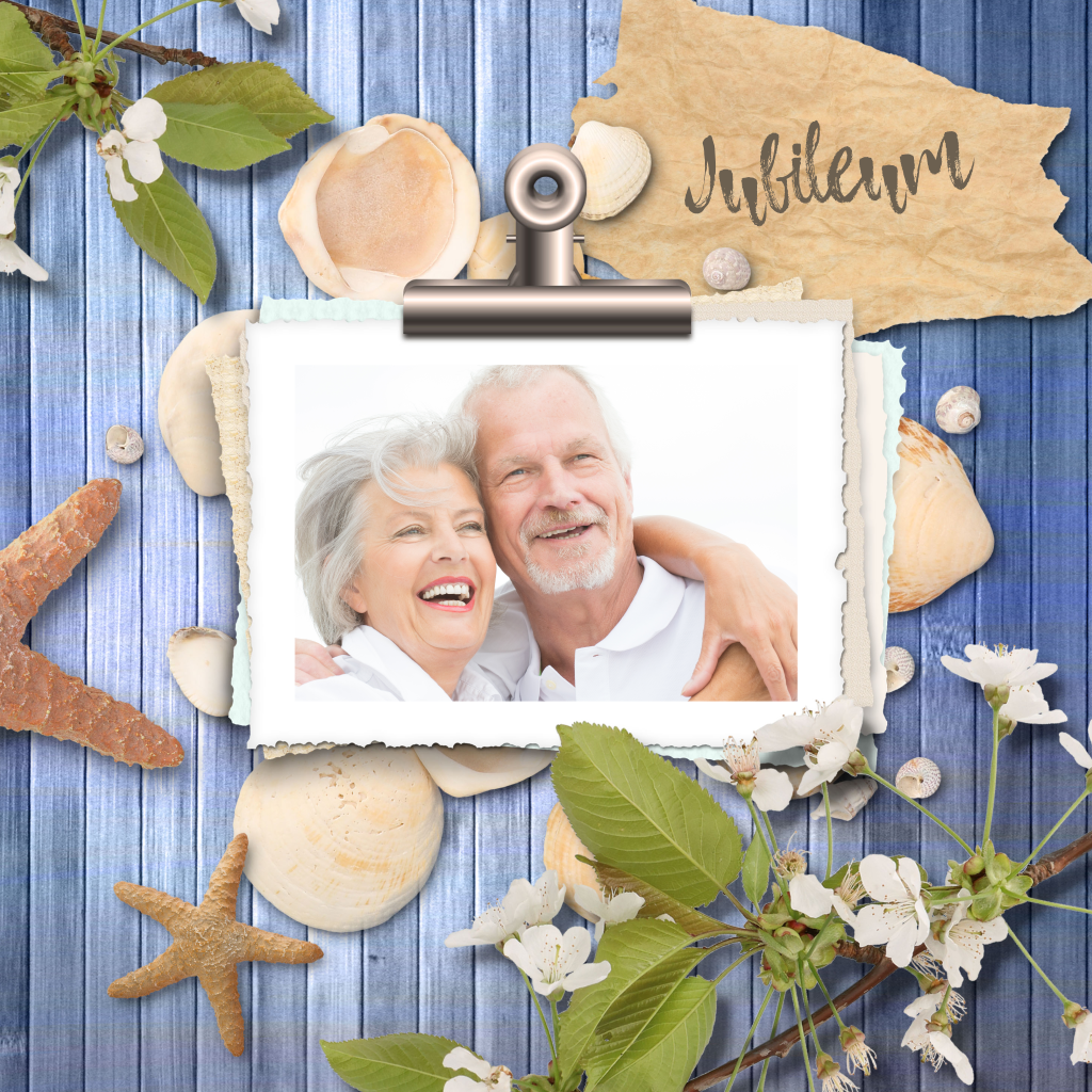 Een mooie jubileum kaart 40 jaar getrouwd met schelpen,zeesterren, papier en bloemen op een blauw houten achtergrond. (5514)