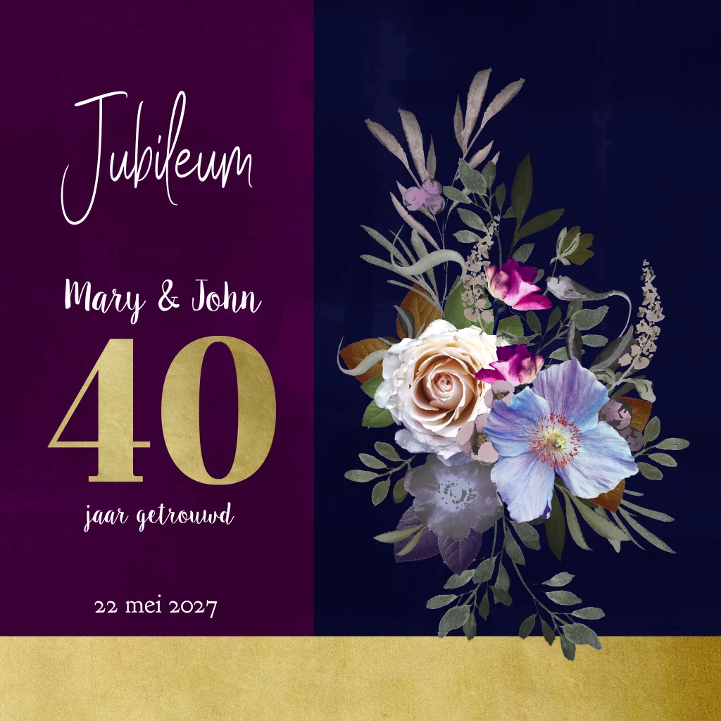 Uitnodiging 40 jaar getrouwd boeket paars blauw