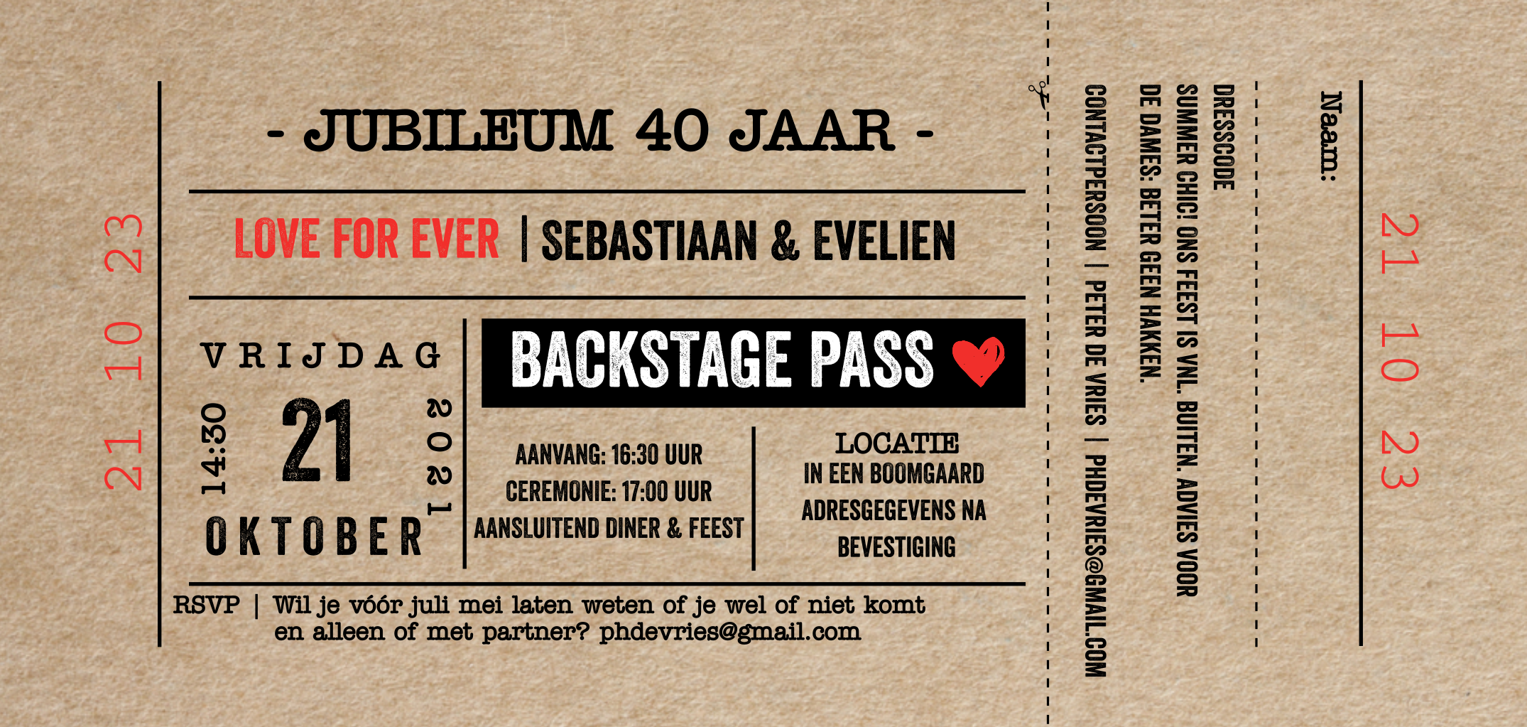 Uitnodiging 40 jarig jubileum ticket langwerpig met kraft