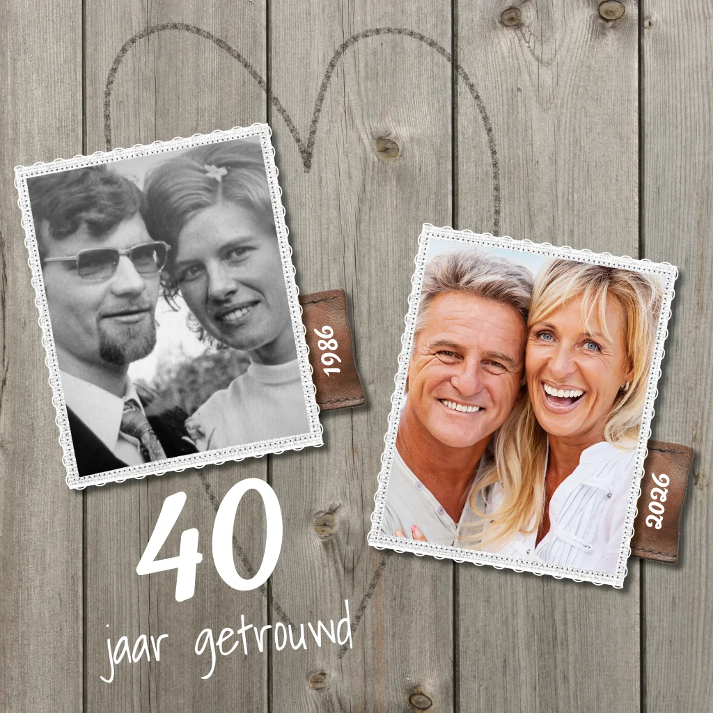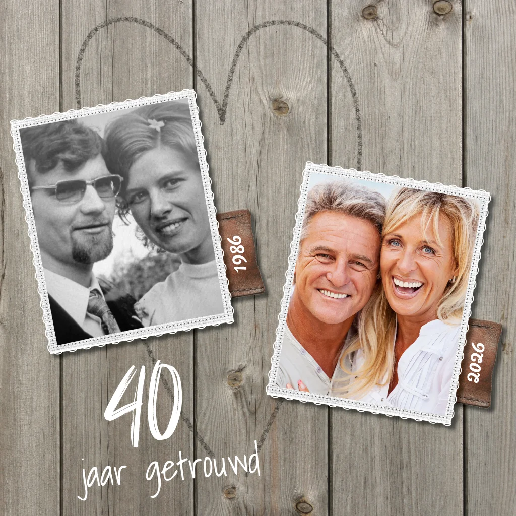 Uitnodiging hout 40 jaar getrouwd met oude foto. Houten planken en getekend hart. (1726)