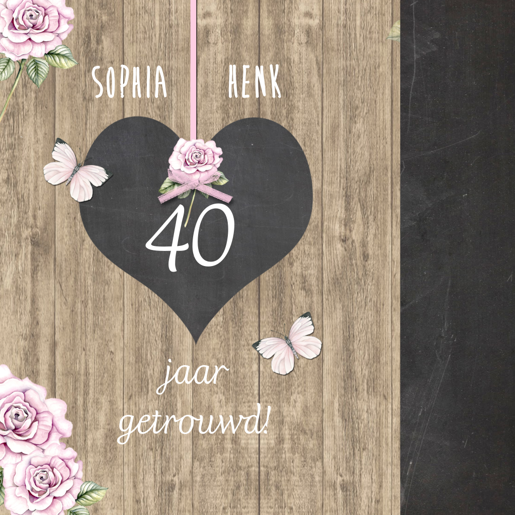 Uitnodiging jubileum 40 jaar getrouwd met hart als krijtbord versierd met rozen en lint op houtprint. (3711)
