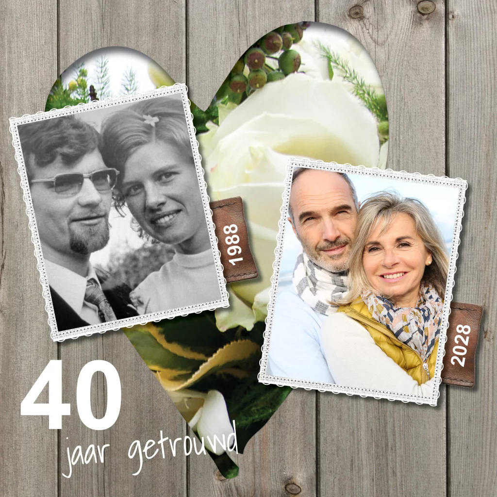 Uitnodigingskaart 40 jaar getrouwd hout met nieuwe en oude foto. Met witte rozen. (1725)