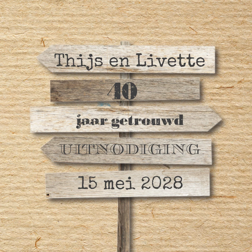 Uitnodigingskaart veertig jaar getrouwd kraft wegwijsborden hout