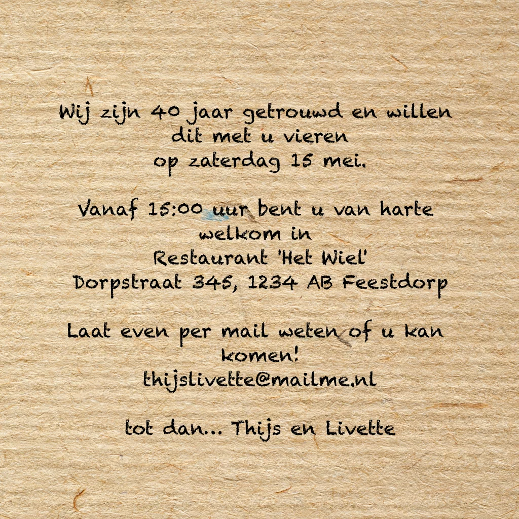 Uitnodigingskaart veertig jaar getrouwd kraft wegwijsborden hout. (2635)