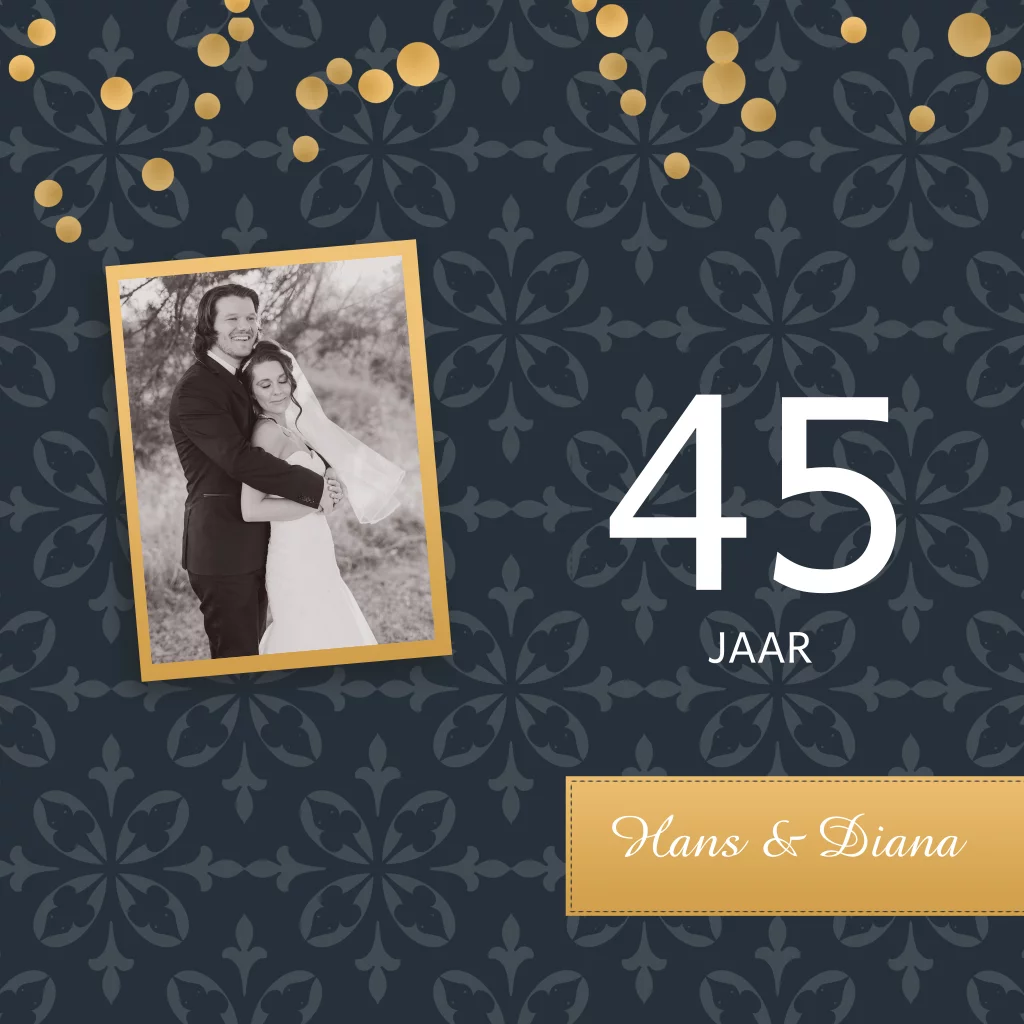 Enkelzijdige jubileumkaart 45 jaar getrouwd met goudkleur, barok look en confetti. (6879)