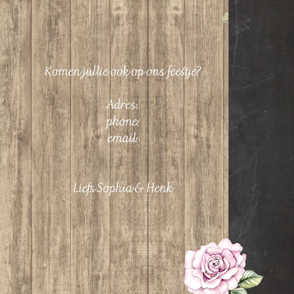 Uitnodiging jubileum 45 jaar getrouwd met hart als krijtbord versierd met rozen en lint op houtprint. (3711)