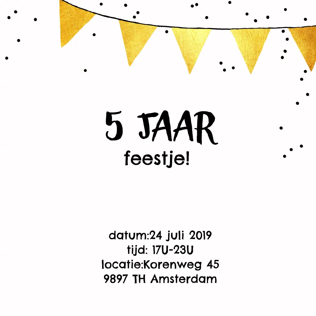 Super feestelijke jubileum uitnodigingskaart voor een hip feestje 5 jaar getrouwd. Origineel en gezellig kaartje met vlaggetjes van goudkleur, zwarte confetti stippen en getekend biertje en wijntje. Let op, geen echt goud!. Vervang je eigen foto en het aantal jaar (5624).