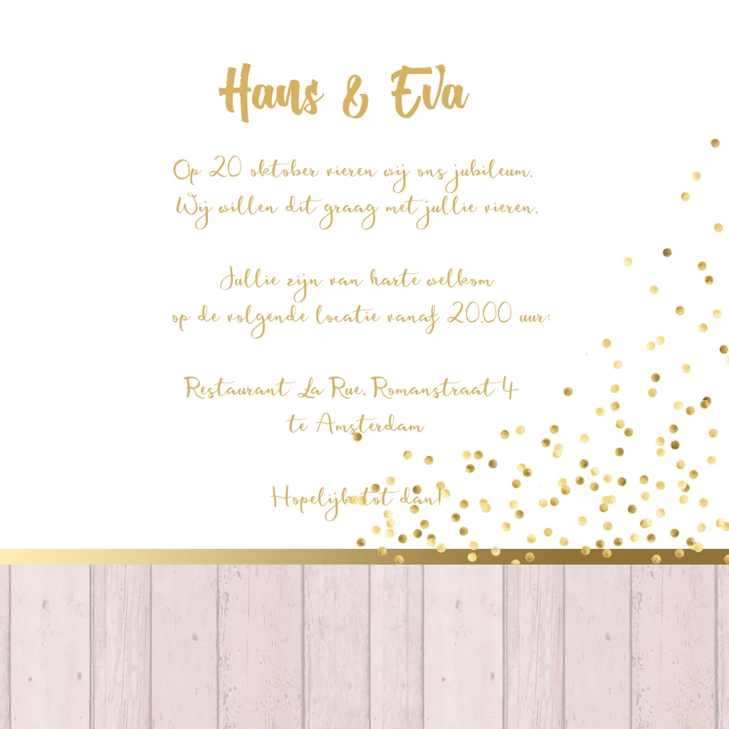 Uitnodiging 40 jaar getrouwd jubileumfeest met prachtige bloemen en goud gekleurde confetti met houten latjes. (5517)