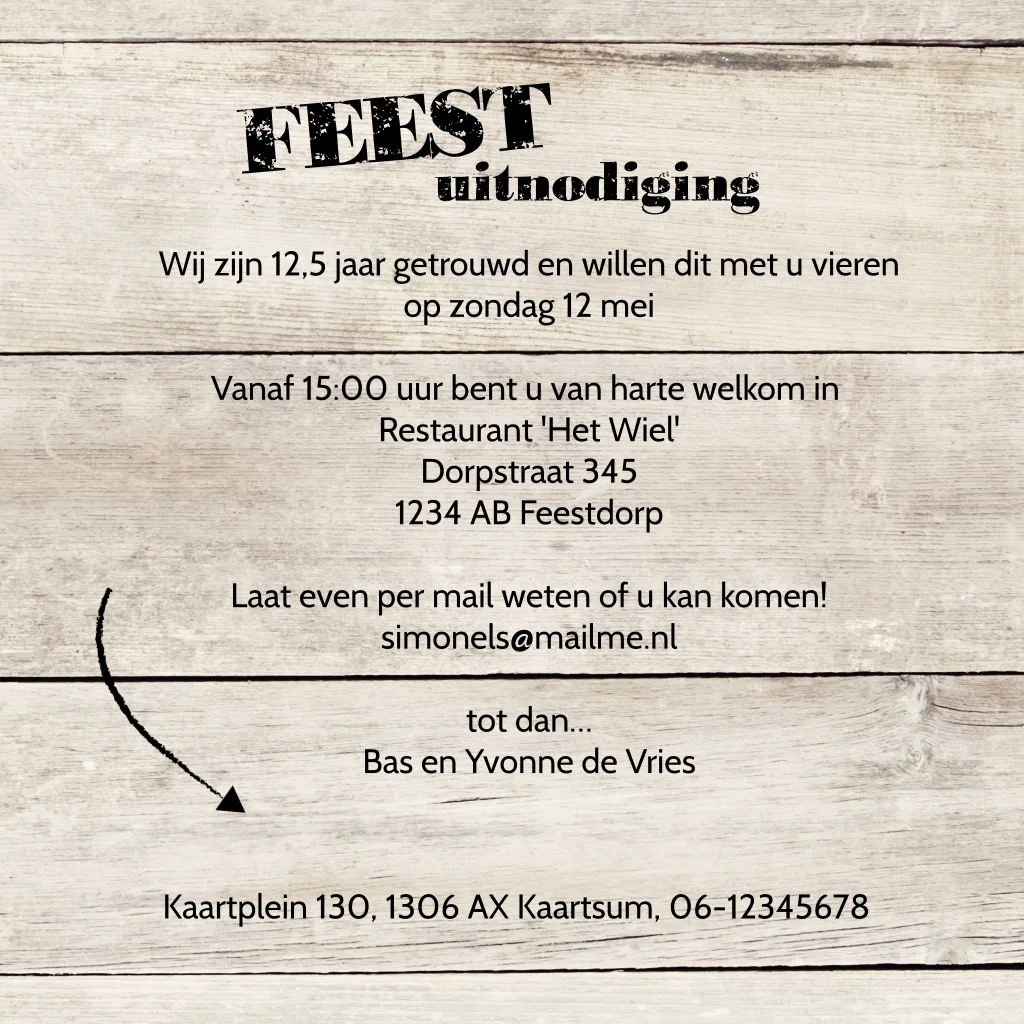 Uitnodiging 12,5 jaar getrouwd jubilea verf met steigerhout en foto. Kleur verf is naar keuze aan te passen. (2040)