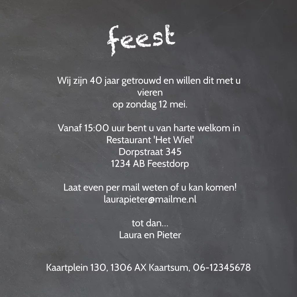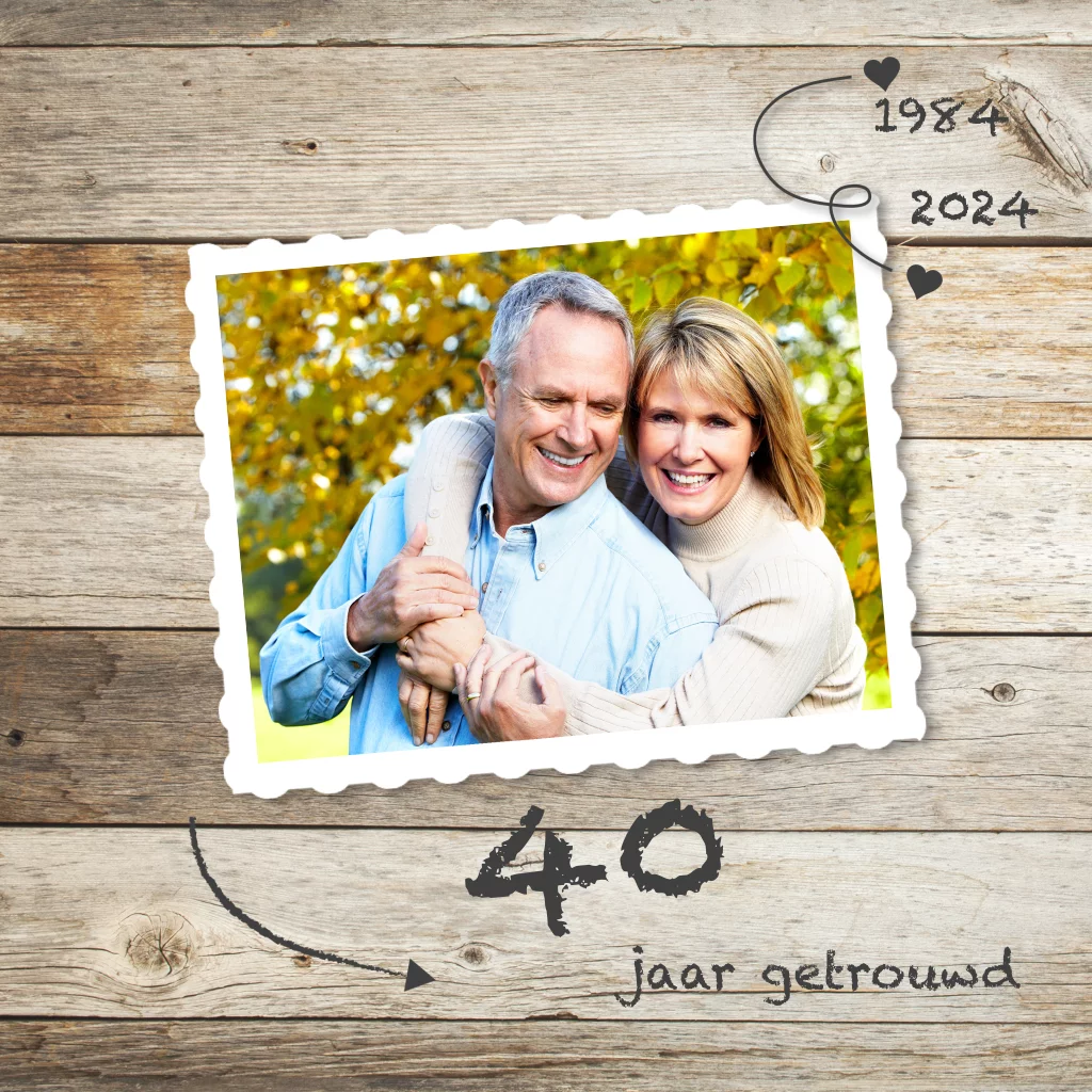 Uitnodigingskaart 40 jarig huwelijk bruin hout en foto