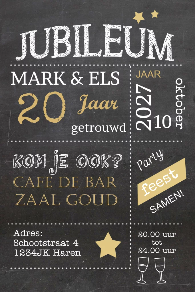 Uitnodigingskaart feestje 20 jaar getrouwd feest op schoolbord met goudkleur details. (1985)