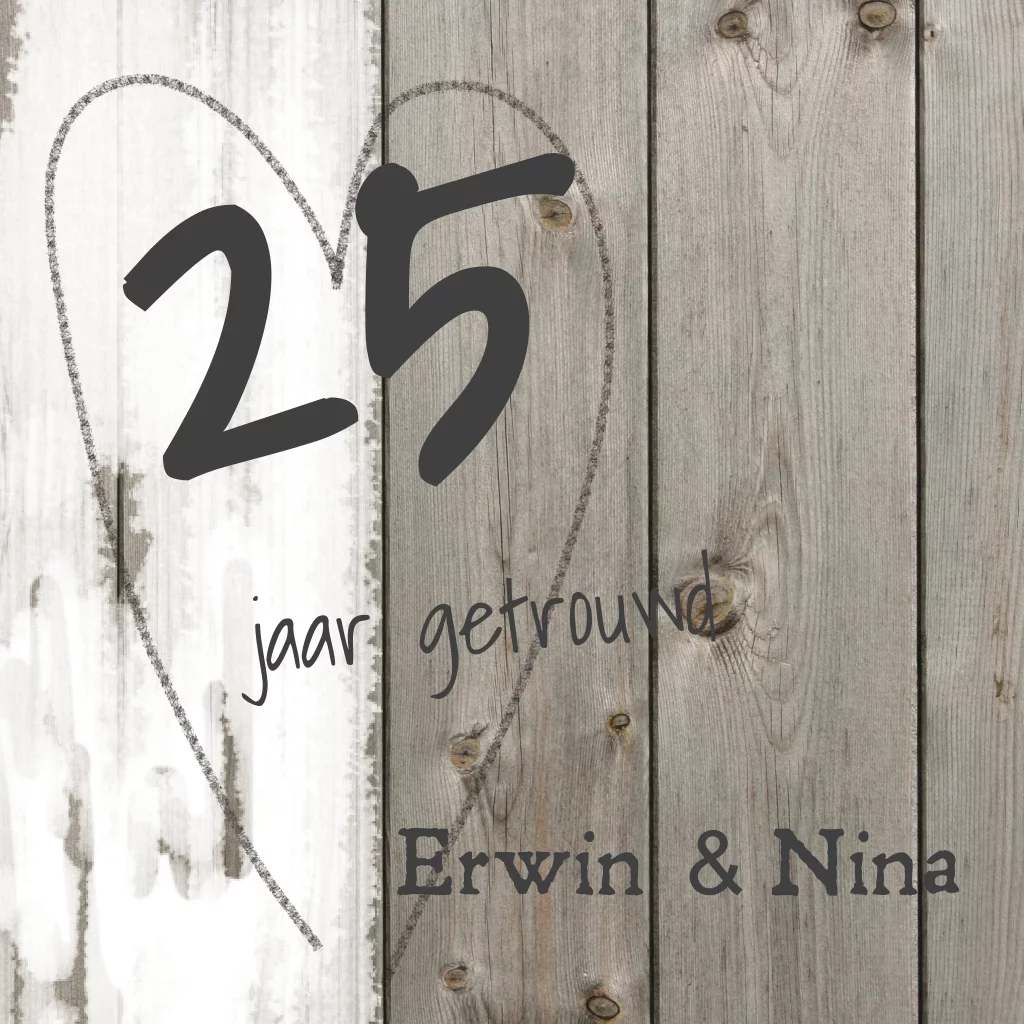 uitnodiging 25 jaar getrouwd hout met linnen. Met dun getekend lijn hart. (2035)