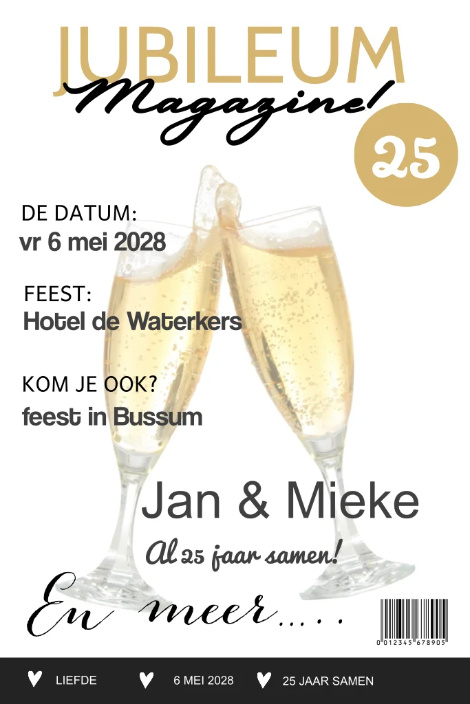 25 jarig jubileumkaart als tijdschrift, aanpasbare kleuren, super origineel en leuk. (2447)