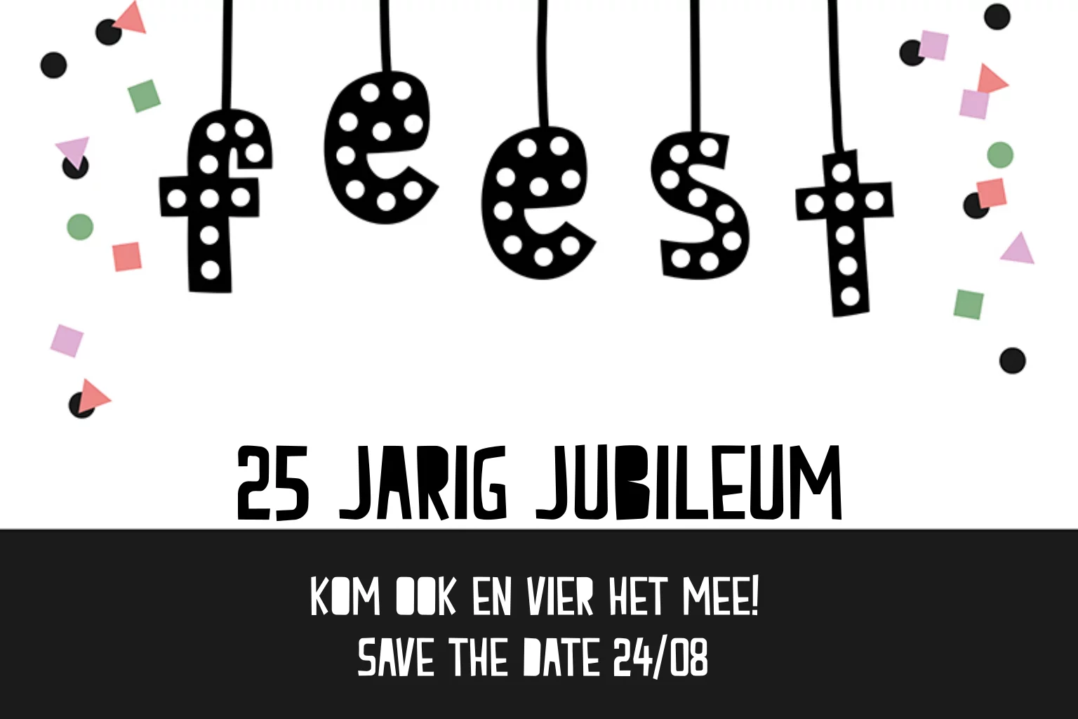 25 jaar getrouwd trendy uitnodiging voor jullie jubileum feest! Gezellige hippe kaart met letterslingers en vrolijke confetti. (7253)