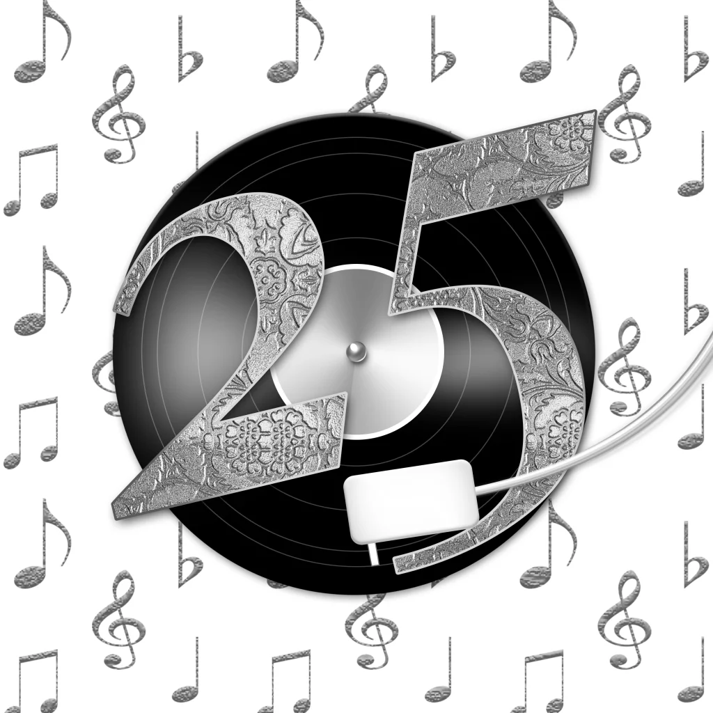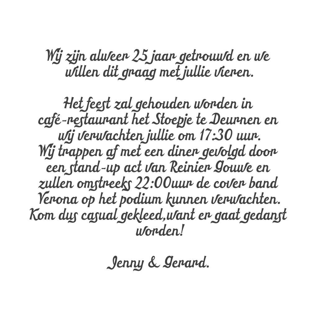 Uitnodiging 25 jaar getrouwd jubileum feest. Platenspeler disco met muzieknoten. (5744) Wil je een ander jaartal in dezelfde stijl, neem dan contact met ons op, je kunt dit helaas niet zelf aanpassen of je moet een 'gewone' tekst plaatsen. kan ook gebruikt worden voor 25 jaar verjaardag of 25 jaar getrouwd